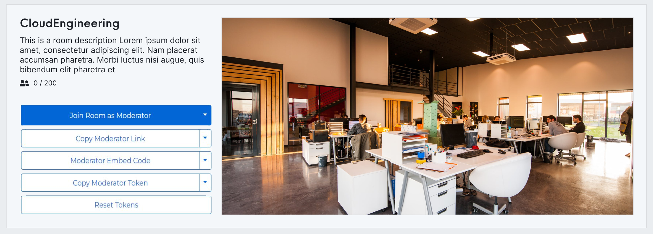 Pressing this button will reset the security tokens associated with a room. Press this button if you want to disable existing access to the room. Note that resetting the tokens will require you to update all the code snippets and links that you previously shared since they will stop working.